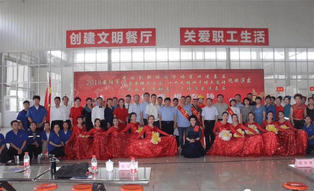 6月6日下午,安陽(yáng)市黨的創(chuàng)新理論萬(wàn)場(chǎng)宣講進(jìn)基層、百名勞模大工匠?十九大精神千場(chǎng)大宣講暨“中國(guó)夢(mèng) 勞動(dòng)美”千場(chǎng)演出送基層巡回演出活動(dòng)走進(jìn)林州重機(jī)。河南省委宣傳部副部長(zhǎng)尹書(shū)博,省委宣傳部理論處副處長(zhǎng)楊小強(qiáng),省委宣傳部理論教育講師團(tuán)副團(tuán)長(zhǎng)趙琳,安陽(yáng)市委宣傳部副部長(zhǎng)冀曉東,安陽(yáng)市委宣傳部理論科長(zhǎng)龍晨曦,安陽(yáng)市總工會(huì)宣教部部長(zhǎng)張艾敏,林州市委常委、宣傳部長(zhǎng)王獻(xiàn)青,林州市總工會(huì)主席栗旺生,副主席張曉云, 公司黨委副書(shū)記、副總經(jīng)理趙正斌,黨委委員、工會(huì)主席路建存及職工代表300余人等出席活動(dòng)。