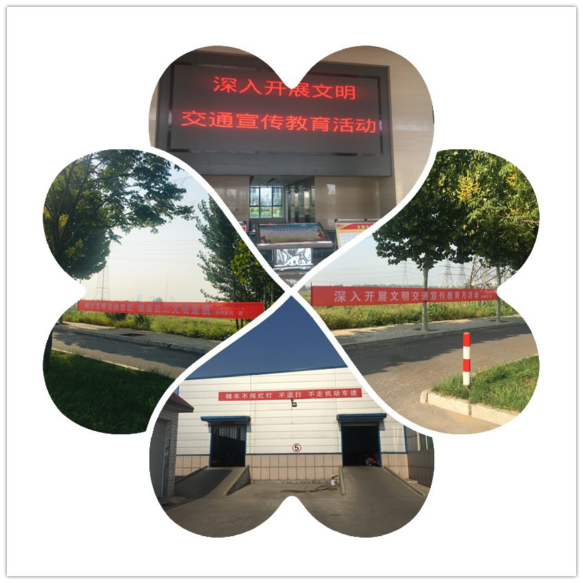 懸掛文明交通宣傳標(biāo)語(yǔ),營(yíng)造濃厚的宣傳氛圍。公司在廠區(qū)門(mén)口對(duì)面及存車(chē)棚外等懸掛文明交通宣傳教育標(biāo)語(yǔ),使員工在上下班路上抬頭就可以看到醒目的標(biāo)語(yǔ),特別是在存車(chē)棚處時(shí)刻提醒員工“騎車(chē)不闖紅燈、不逆行、不走機(jī)動(dòng)車(chē)道”。通過(guò)懸掛標(biāo)語(yǔ),營(yíng)造了濃厚的文明交通宣傳教育氛圍。
